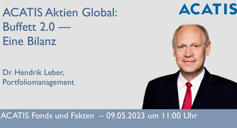 Wir laden Sie herzlich ein zu ACATIS Fonds und Fakten am 9. Mai 2023 ab 11.00 Uhr mit Dr. Hendrik Leber, unter dem Titel „ACATIS Aktien Global: Buffett 2.0 – Eine Bilanz.